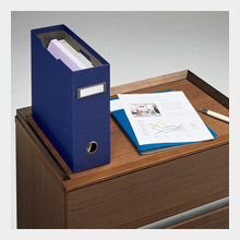 | 拡張モジュールのサイドテーブルを連結すると作業領域もグンと拡がります。 | サイドキャビネットの天板は上に乗せたものが転がり落ちにくい転び止め縁仕様です。 | 書庫やロッカーの扉にはゆっくりと静かに閉まるサイレントクローズ機構を採用しています。 |