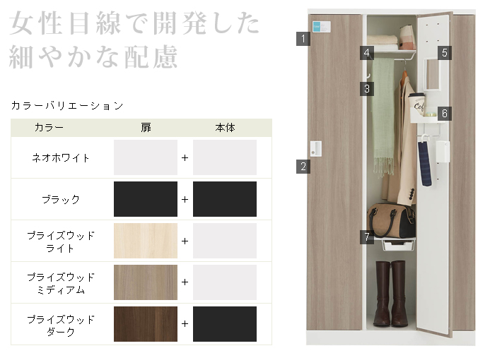 | 下部の網棚には小さな引き出しが付いています。小物の収納に最適です。 | 網棚の高さを変えることで、コートやブーツ、スーツケースも収納できます。※2段は固定棚 | 木目扉タイプは内部がハニカムコア構造になっておりので、開け閉めの際の音を軽減します。 |