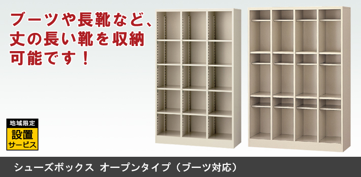 ブーツや長靴など丈の長い靴にも対応したオープンタイプのシューズボックス